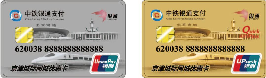 “中鐵銀通京津城際同城優(yōu)惠卡”是由中鐵銀通支付有限公司發(fā)行,僅含電子現(xiàn)金支付,卡背面印有持卡旅客的有效身份證件號碼、姓名和照片的預(yù)付卡。主要應(yīng)用于京津城際實(shí)名制刷卡乘車業(yè)務(wù)并提供票價折扣優(yōu)惠?!爸需F銀通京津城際同城優(yōu)惠卡”種類分為金卡、銀卡兩類,持金卡乘坐一等座席位,持銀卡乘坐二等座席位。